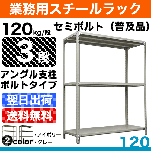 スチール棚 幅180×奥行60×高さ150cm 3段 単体 120kg/段 セミボルト(普及品) 重量:43kg