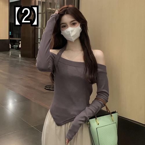 オフショルダー トップス レディース 長袖 かわいい 春秋 セクシー おしゃれ ホルターネック 無地 白 黒 グレー