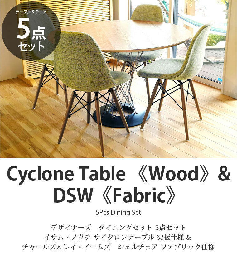 デザイナーズ ダイニングセット 5点セットイサム・ノグチ サイクロンテーブル 突板仕様 & チャールズ&レイ・イームズ シェルチェア ファブリック仕様 Cyclone Table 《Wood》& DSW《Fabric》 5Pcs Dining Set 2つのデザイナーズ家具をお得なセットで 日系アメリカ人彫刻家、イサム・ノグチによる「サイクロンテーブル」とチャールズ&レイ・イームズによる「シェルチェア」をお得なダイニングセットにしました。
