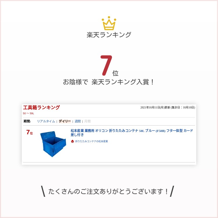 ・【強度検査を実施】耐圧荷重25.3kN(2580kgf) ・底面安全荷重25kg ・材質:ポリプロピレン(ほこりの付きにくい帯電防止剤配合) ・商品管理に便利なカード差し(片面)が標準装備 ・金属ピン18本 ・日本製 ・内寸:490×332×303mm ・外寸:536×366×337mm ・折りたたみ時の高さ:100mm ・重量:3.4kg ・フタ一体型 ・メーカー名:松本産業株式会社 ・50個以上のご注文は事前にお問い合わせください。
